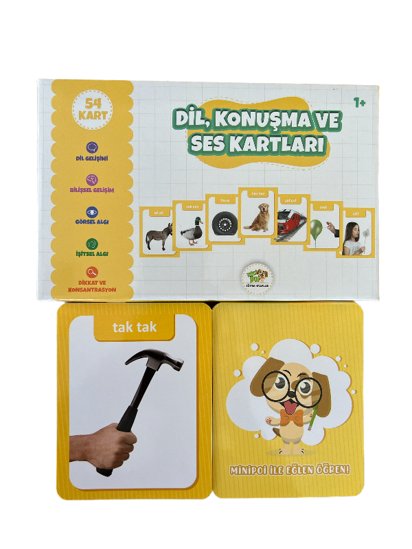 - Dil, Konuşma ve Ses Kartları; çocukların ve özel eğitim öğrencilerinin dil gelişimini desteklemek için özel olarak tasarlanmıştır. Bu kartlar, bilişsel gelişim, görsel-işitsel algı ve dikkat gelişimine katkı sağlarken gerçek yaşamdan alınmış görsellerle desteklenmiştir.Kartların Özellikleri: